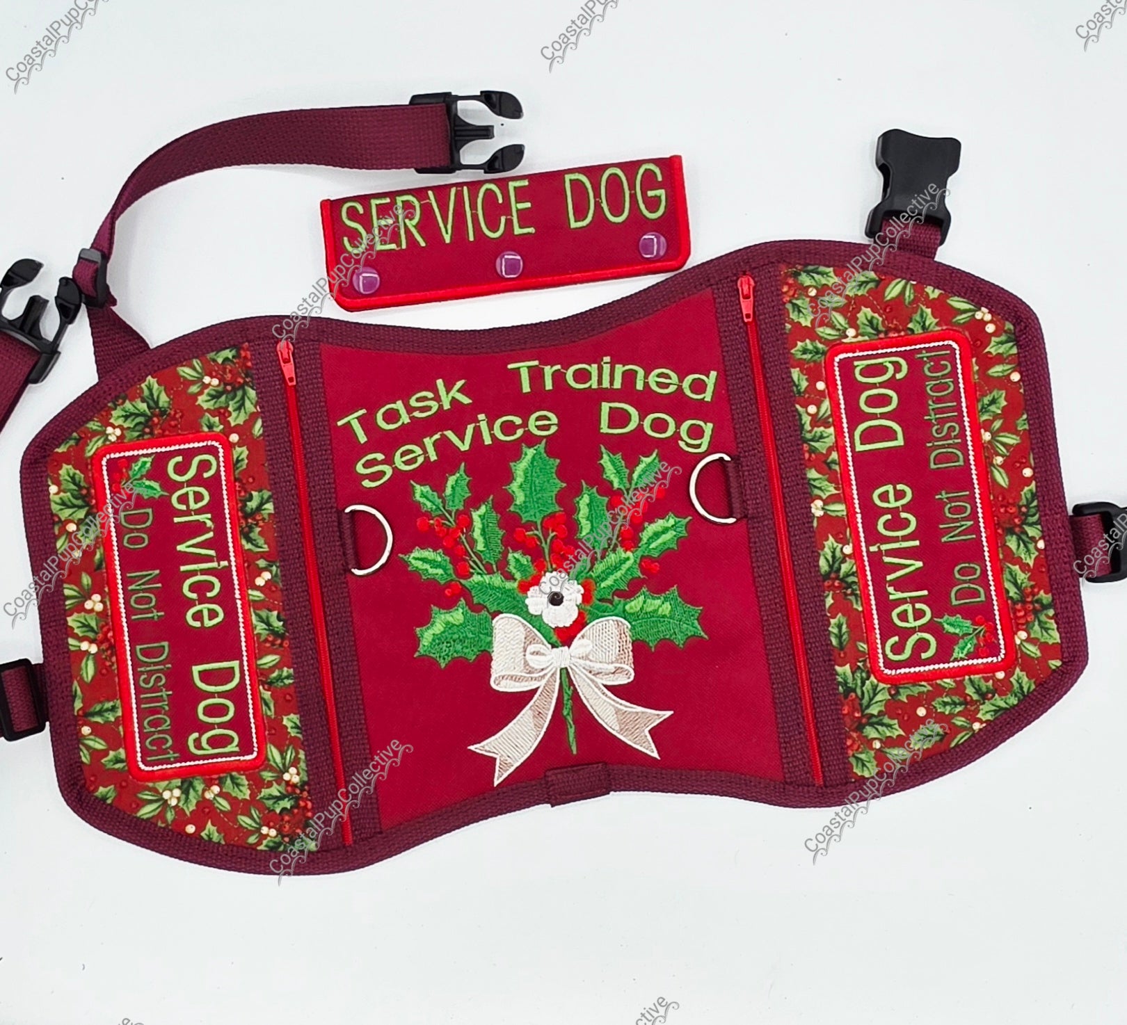 Wine canvas holly bouquet vest with cotton applique patch sides, zipper pockets and two d-rings with matching leash wrap. 17.5" panel. Recommended girth 25-32"