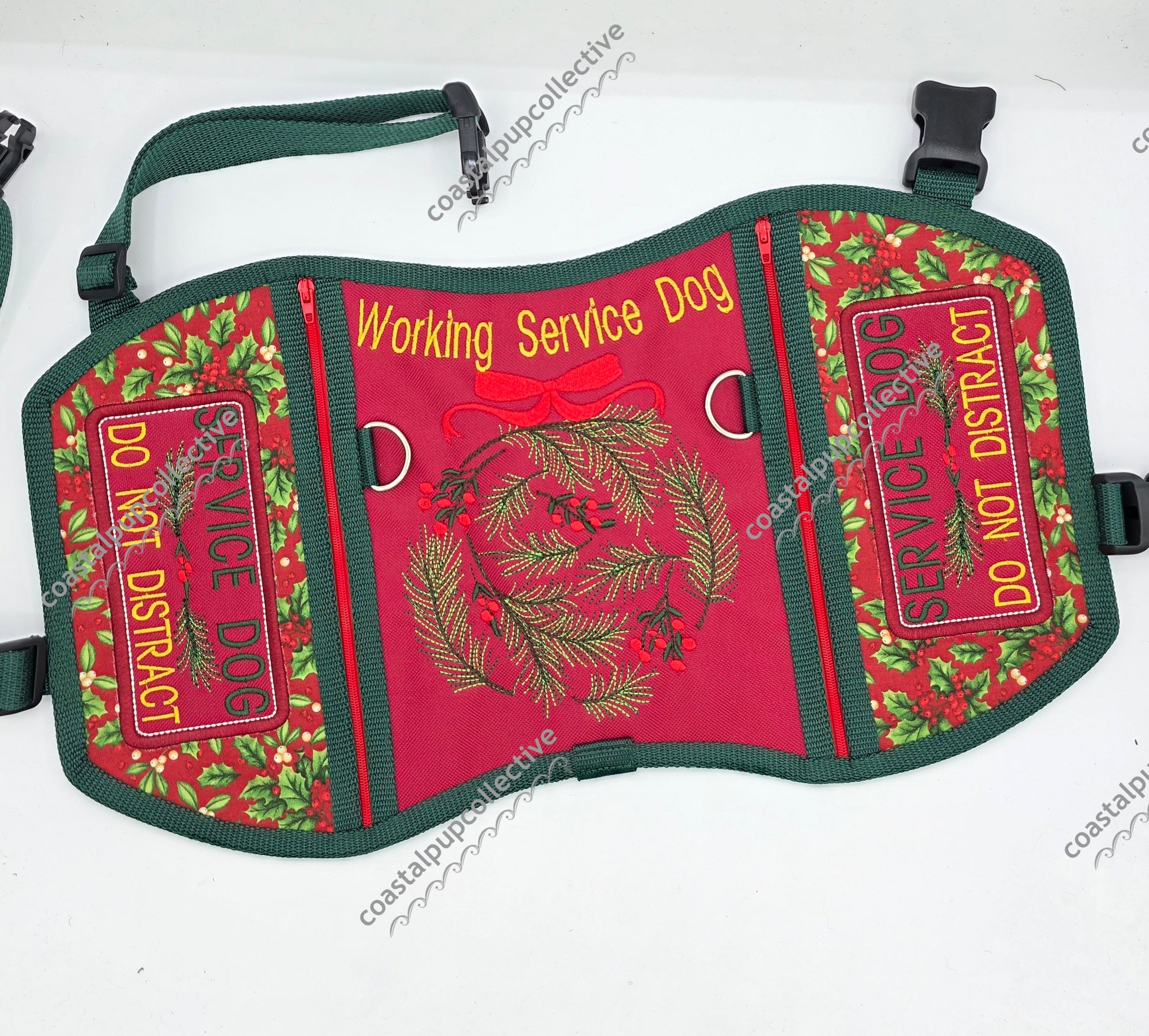 Wine canvas holly wreath vest with cotton applique patch sides, zipper pockets and two d-rings. 18" panel. Recommended girth 27-33"