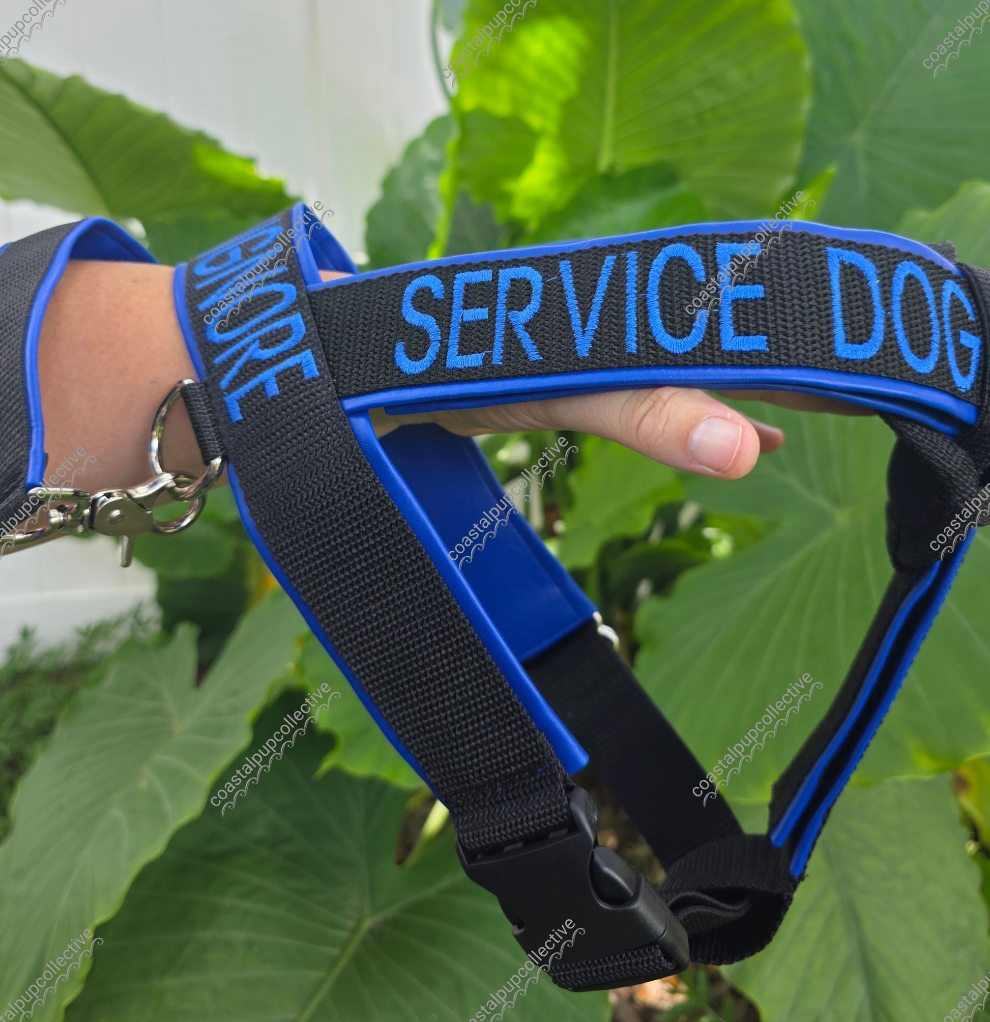 Black webbing with royal blue vinyl y-front harness with velcro adjustments, triple padded chest plate and matching grounding strap. 28-34" girth, 8-12" shoulder, 9-13" sternum, 14" grounding strap. Reversible convertible is 17" panel with zipper pockets